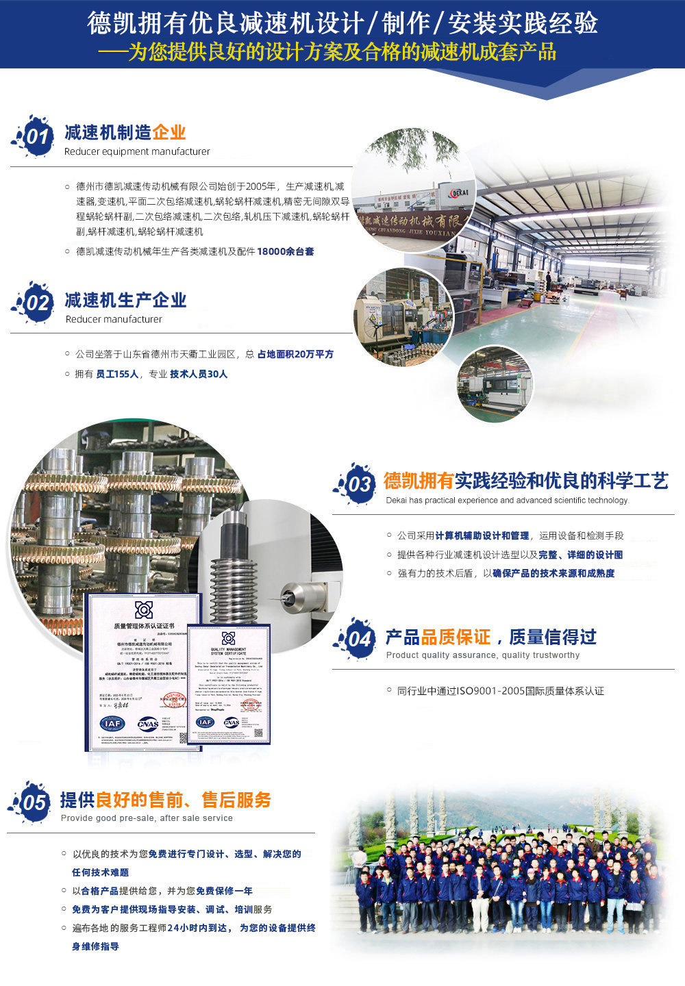 德州市德凱減速傳動機械有限公司,生產(chǎn)減速機,減速器,變速機,平面二次包絡(luò)減速機,蝸輪蝸桿減速機,精密無間隙雙導程蝸輪蝸桿副,二次包絡(luò)減速機,蝸輪蝸桿,軋機壓下減速機,蝸輪蝸桿副,蝸桿減速機,蝸輪蝸桿減速機,公司占地面積20萬平方,員工155人,技術(shù)人員30人,年生產(chǎn)各類減速機及配件18000余臺套。在同行業(yè)中通過了ISO9001質(zhì)量管理體系認證。公司設(shè)備齊全、技術(shù)力量強大、檢測手段完善,引進國外大型數(shù)控二次包絡(luò)機床GJK75加工數(shù)控4臺,可加工到800二次包絡(luò)蝸輪蝸桿。引進漢江S7732蝸桿磨床3臺,精度可達5級。公司擁有輝光離子氮化爐4臺,經(jīng)該設(shè)備氮化后可提高蝸桿表面硬度、耐磨性高、提高疲勞強度、變形量小、耐蝕性、...